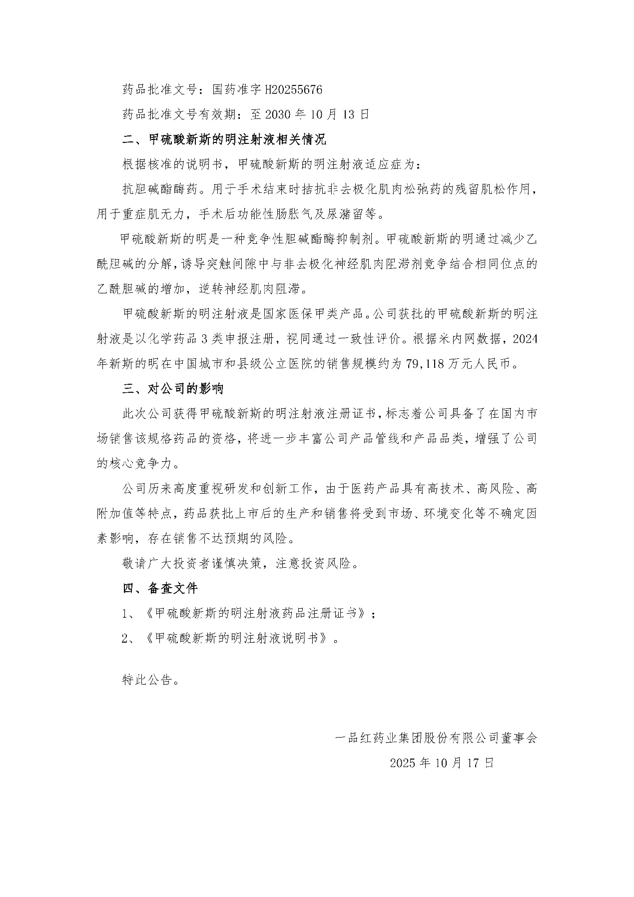 ¿ËÈÕ£¬97¹ú¼ÊÊÕµ½¹ú¼ÒÒ©Æ·¼àÊÓ¹ÜÀí¾ÖÅú׼ǩ·¢µÄ¹ØÓÚ¼×ÁòËáÐÂ˹µÄÃ÷×¢ÉäÒºµÄ¡¶Ò©Æ·×¢²áÖ¤Êé¡·¡£¼×ÁòËáÐÂ˹µÄÃ÷×¢ÉäÒºÊǹú¼ÒÒ½±£¼×Àà²úÆ·¡£¹«Ë¾»ñÅúµÄ¼×ÁòËáÐÂ˹µÄÃ÷×¢ÉäÒºÊÇÒÔ»¯Ñ§Ò©Æ·3ÀàÉ걨ע²á£¬ÊÓͬͨ¹ýÒ»ÖÂÐÔÆÀ¼Û¡£